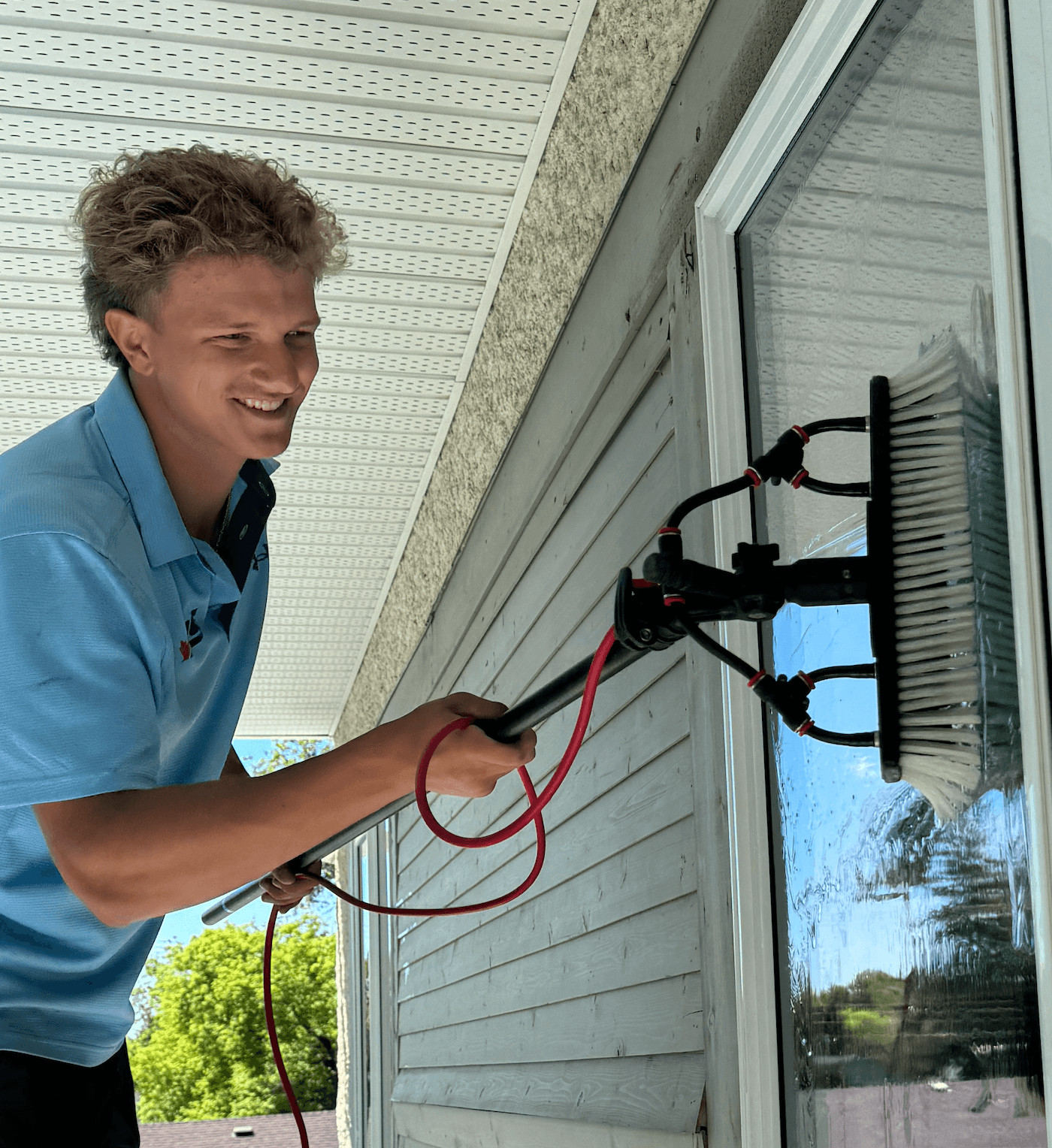Our primary means of cleaning exterior windows is by using a water-fed extension pole system. This method sources water directly from your home's spigot, purifying it through a De-Ionizing ("DI") tank. The purified water is then channelled through a hose to a brush head on an extended pole. Our system does not use any chemicals ensuring the runoff is therefore safe for both plants and animals – a feature many of our customers love.